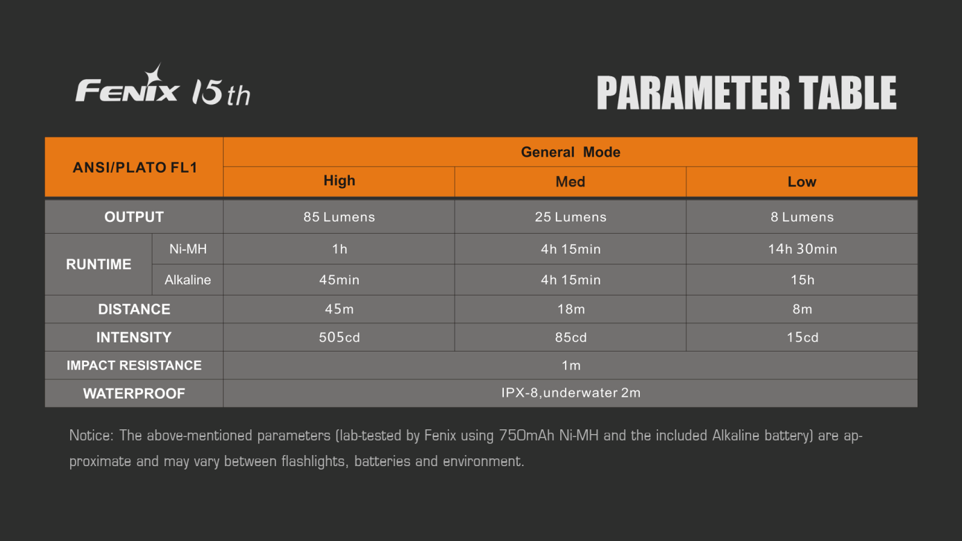 Všechny parametry svítilny (světelný tok, doba provozu na baterie, vodotěsnost, dosvit a nárazuvzdornost) jsou měřeny v souladu s normou ANSI/NEMA FL 1-2009 Flashlight Basic Performance Standard.