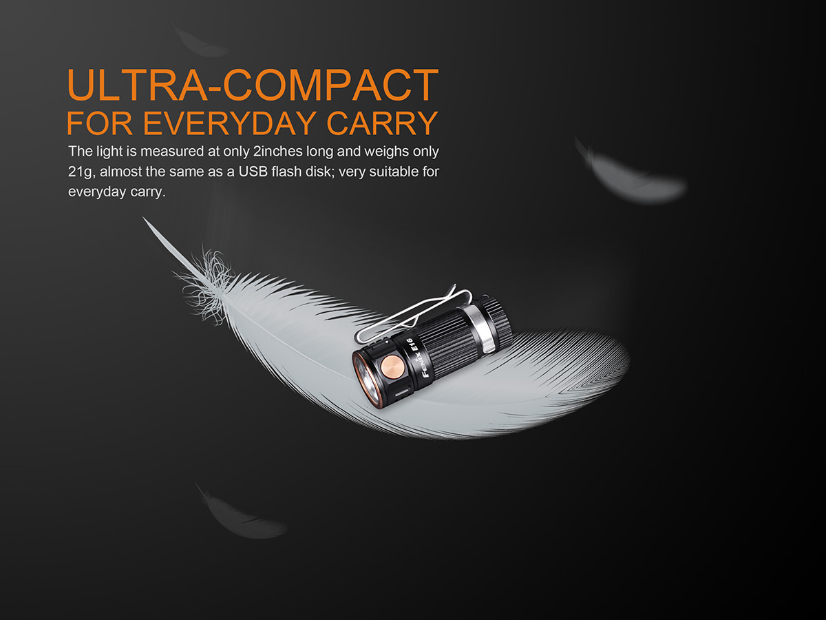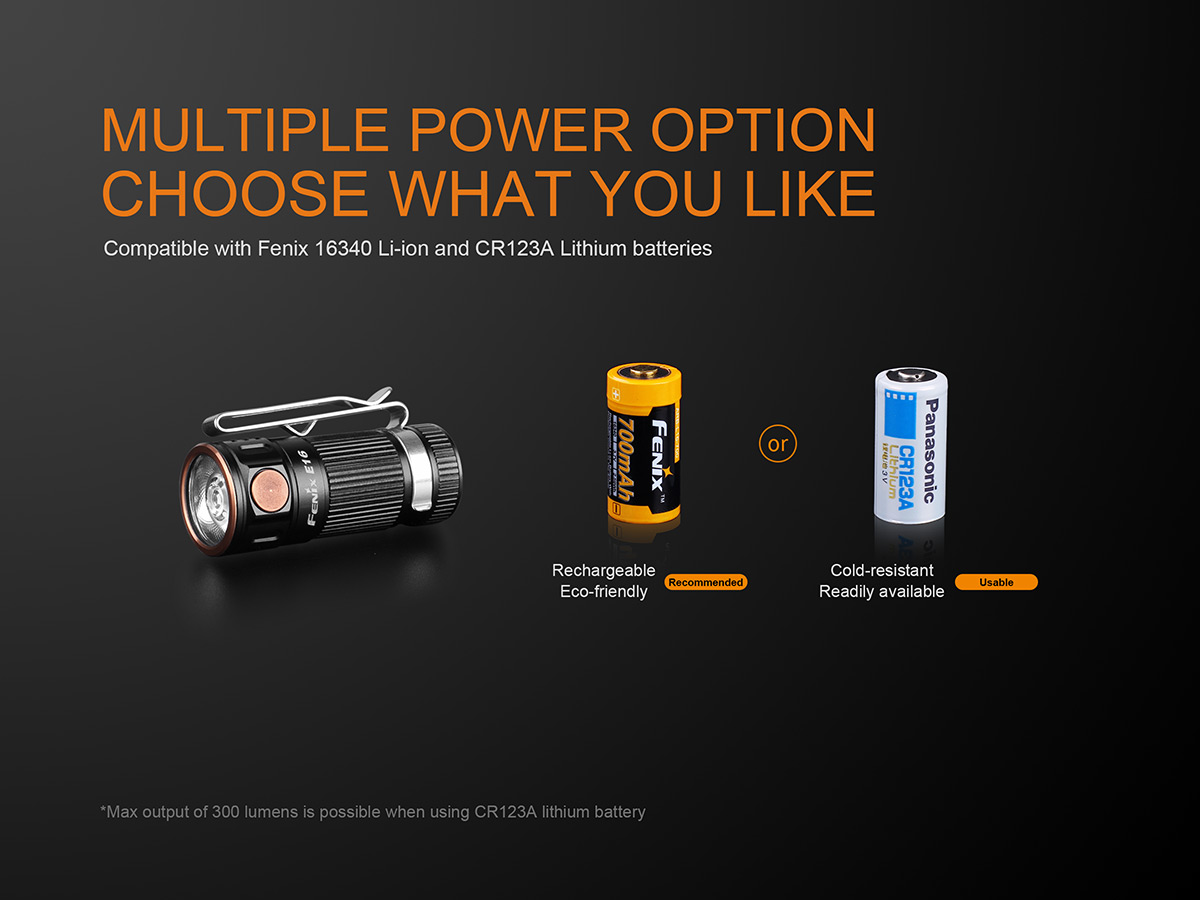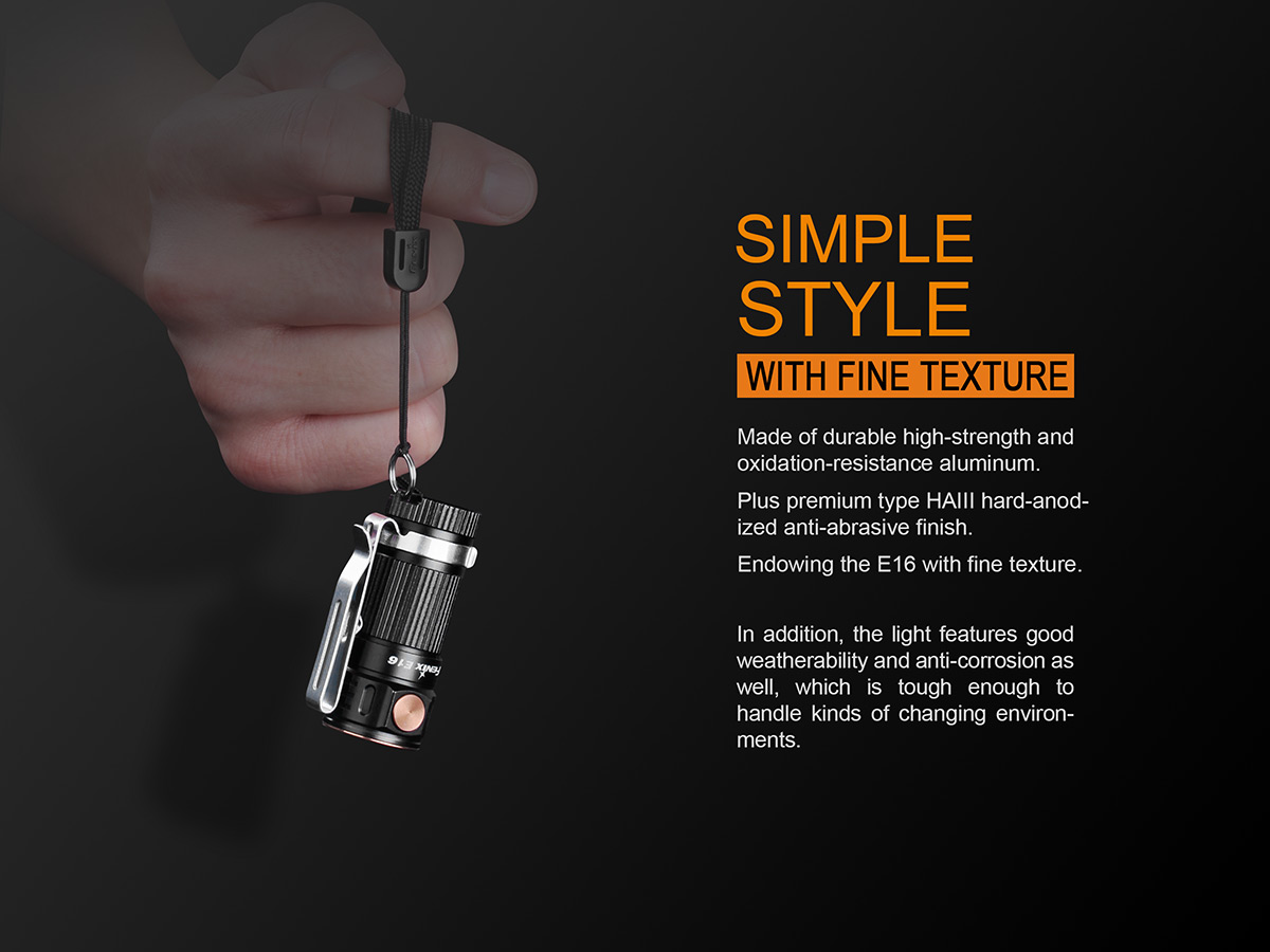 Fenix E16 je miniaturní kapesní LED svítilna s krátkodobým extrémním výkonem až 700 lumenů (ANSI). Tento model používá jako světelný zdroj diodu Cree XP-L HI s teplejším odstínem světla. Díky délce pouhých 51 milimetrů a váze 21 gramů ji lze nosit stále při sobě – v kapse, na klíčích či v kabelce. Lze ji napájet nabíjecím Li-ion akumulátorem RCR123A, ale i jednorázovou CR123A baterií.