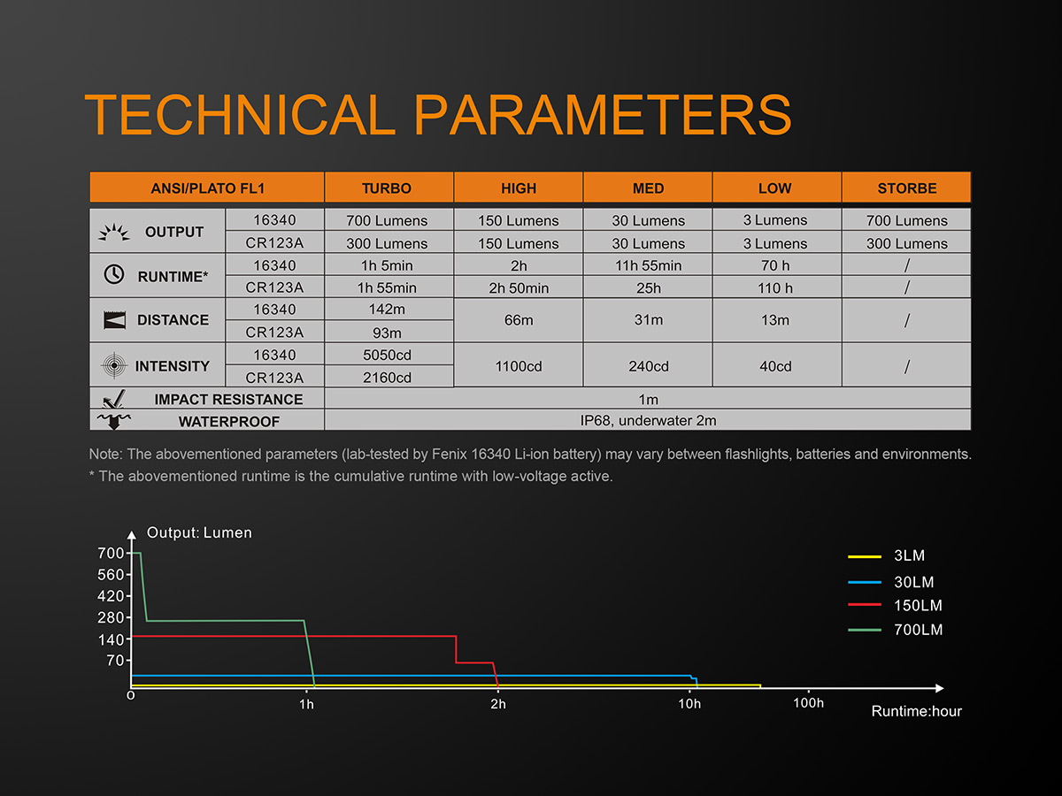 Všechny parametry svítilny (světelný tok, doba provozu na baterie, vodotěsnost, dosvit a nárazuvzdornost) jsou měřeny v souladu s normou ANSI/NEMA FL 1-2009 Flashlight Basic Performance Standard.