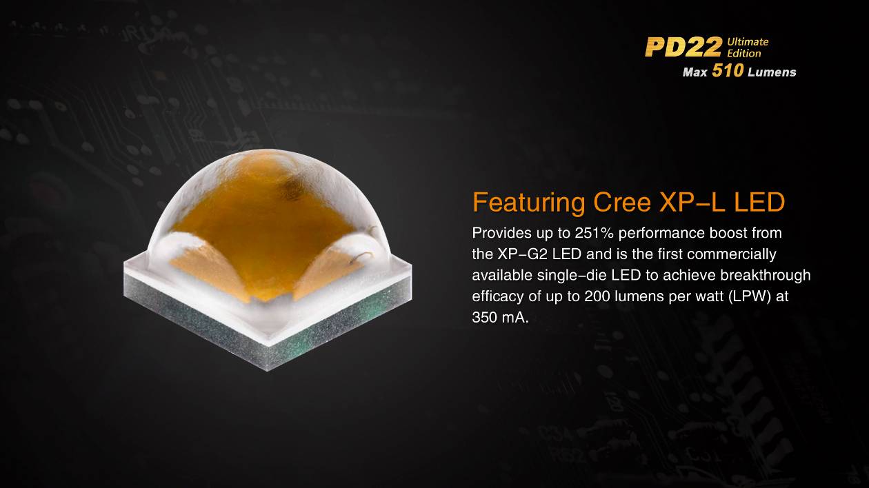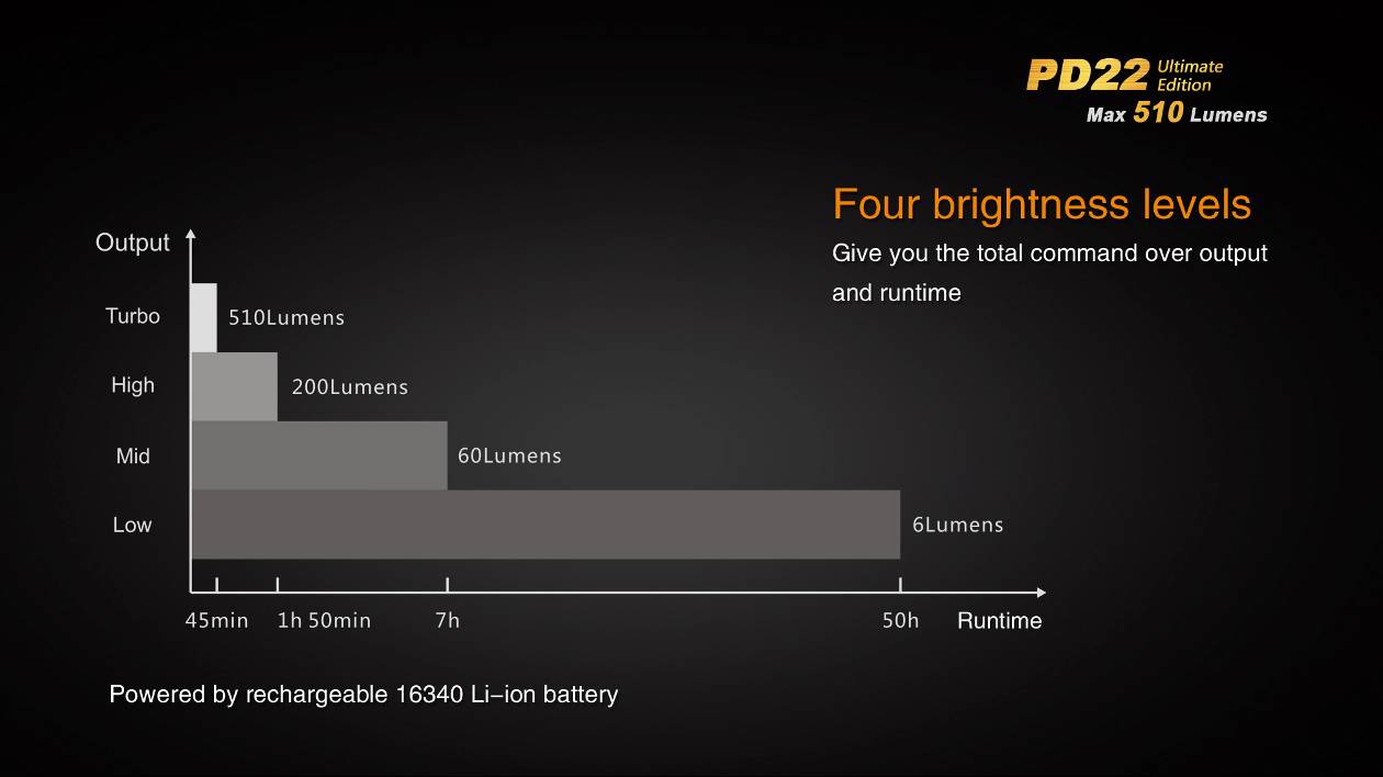 PD22 Ultimate Edition vás překvapí svým výkonem až 510 lumenů a dosvitem až 130 metrů. Je osazena nejnovější diodou Cree XP-L a nabídne výdrž až 100 hodin. K napájení lze použít jednu jednorázovou CR123A baterii, či akumulátor typu RCR123A. Svítilna disponuje šesti různými režimy osvětlení, které umožní volit mezi vysokým výkonem a dlouhou výdrží. Další přednosti tohoto modelu jsou nízká váha, délka pouhých 9 centimetrů, zapínání taktickým spínačem na konci a jednoduché přepínání režimů bočním tlačítkem u reflektoru. Pokud hledáte malou ruční svítilnu, která se pohodlně vejde do kapsy a poskytne nadstandardní výkon, pak je PD22 Ultimate určena přesně pro vás.