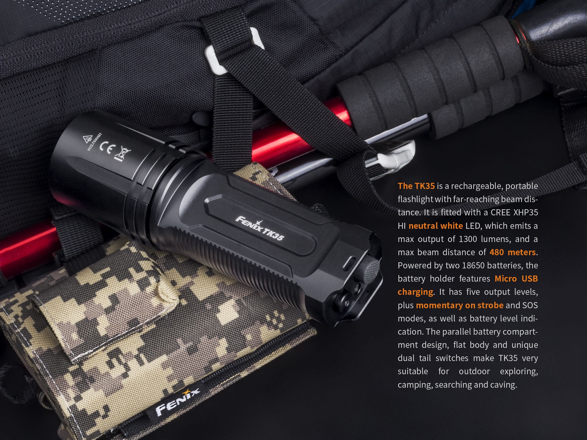 Čtvrtá generace svítilny Fenix TK35 přináší světelný tok až 1300 lumenů (ANSI) a dosvit až 480 metrů. Kromě navýšení výkonu a dosvitu svítilna nabízí možnost nabíjení v držáku baterií přes micro USB konektor. K napájení lze použít dva Li-ion akumulátory typu 18650 (nejsou součástí balení). Dosvitu 480 metrů bylo dosaženo použitím nejnovější vysoce výkonné LED Cree XHP35 HI s teplejším odstínem světla. Svítilna používá duální taktický spínač, který umožňuje rychlejší a spolehlivější ovládání v krizových situacích. Lze ji například snadno zapnout přímo do stroboskopického režimu. Celkem sedm konstantně regulovaných úrovní výkonu pro možnost volby mezi maximálním výkonem a výdrží (až 235 hodin), nechybí ani dva skryté zábleskové režimy strobe a SOS.