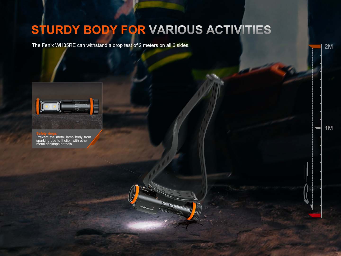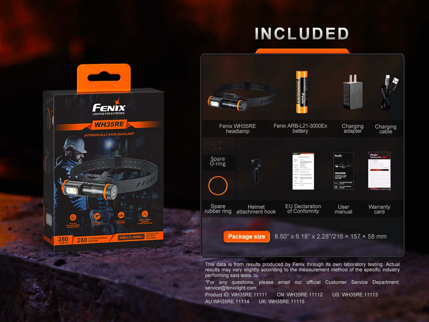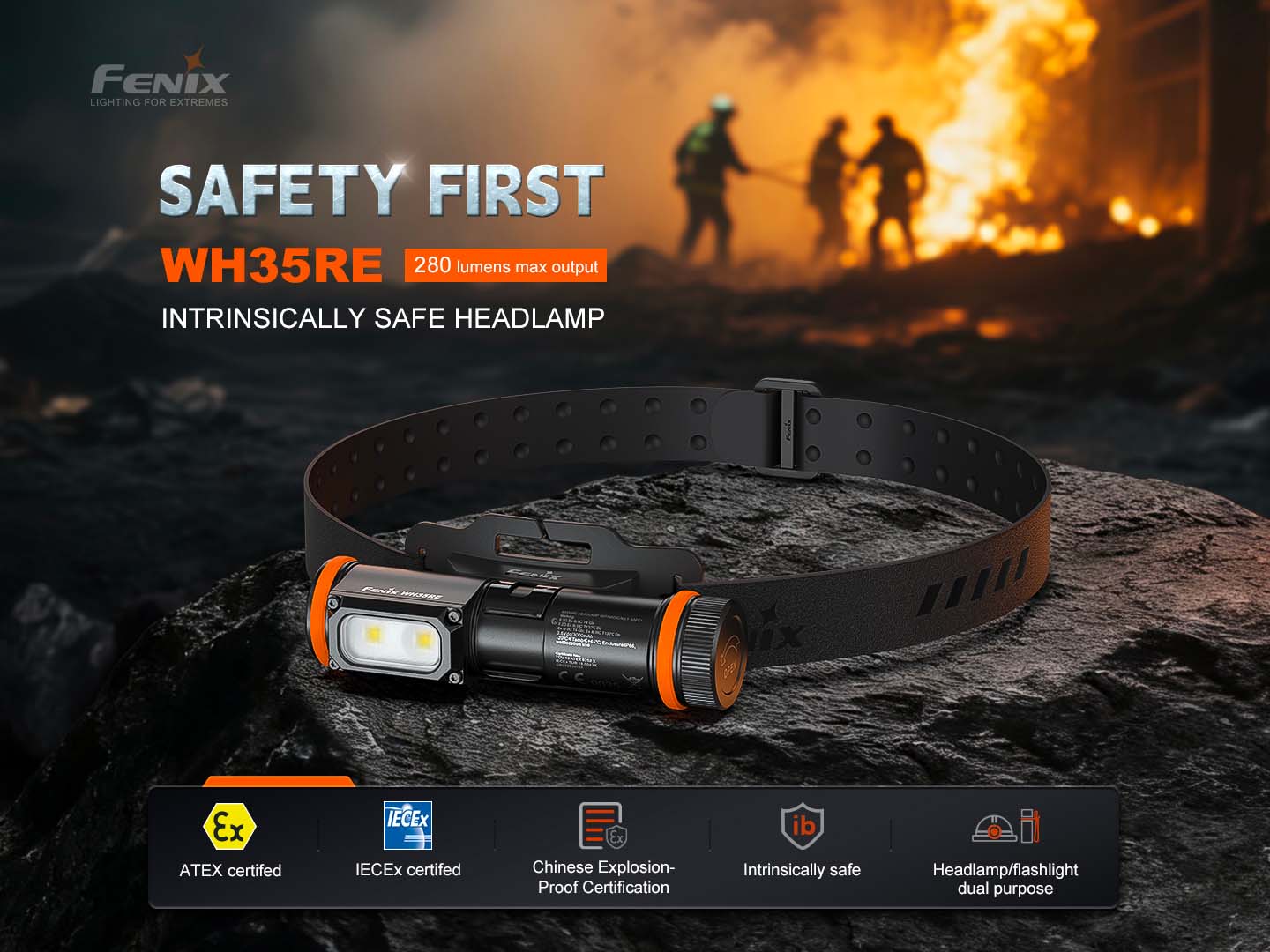 Fenix WH35RE je bezpečná pracovní čelovka do výbušného prostředí, určená pro různé oblasti s rizikem výbuchu, kromě podzemních dolů. Je opatřena certifikací ATEX/IECex. Nabízí maximální výkon 280 lumenů a napájí ji jeden speciálně upravený Li-ion akumulátorem ARB-L21-3000Ex s kapacitou 3000 mAh (je součástí balení), který se dobíjí přímo ve svítilně přes moderní USB-C konektor. Praktičnost čelovky zvyšuje možnost vyjmout světlo z hlavového držáku a používat ji i jako kapesní či pracovní svítilnu. Navíc je čelovka opatřena ocelovou odnímatelnou sponou, takže ji snadno uchytíte na kapsu či popruh. Její velký spínač umožňuje jednoduché a přesné ovládání – dokonce i v rukavicích.