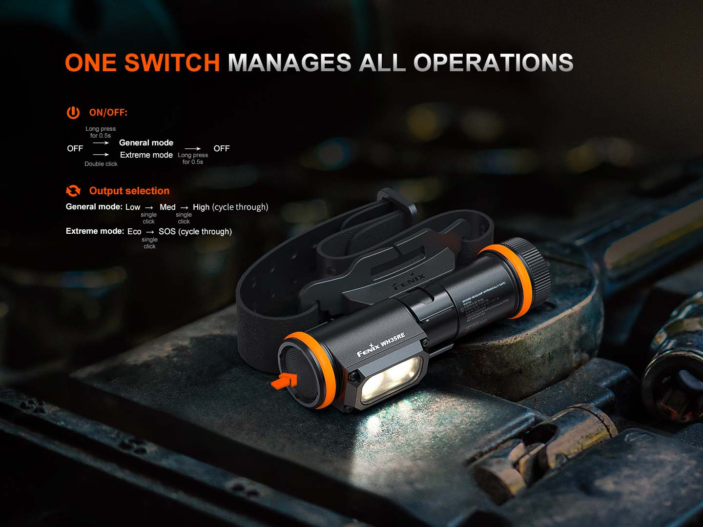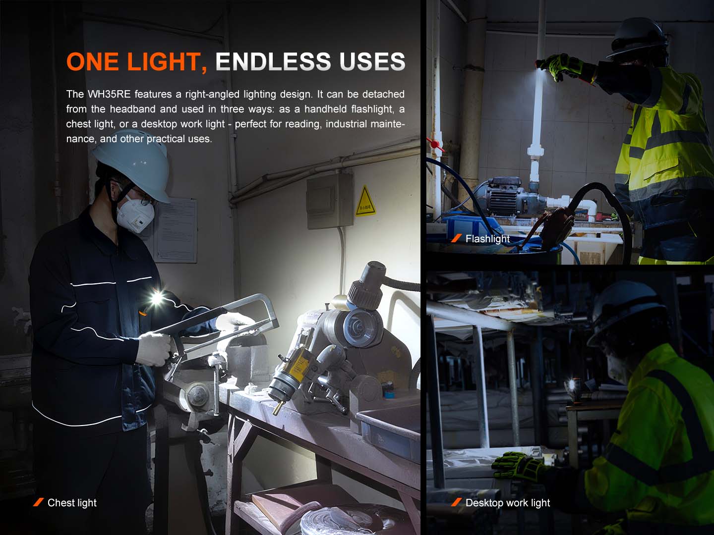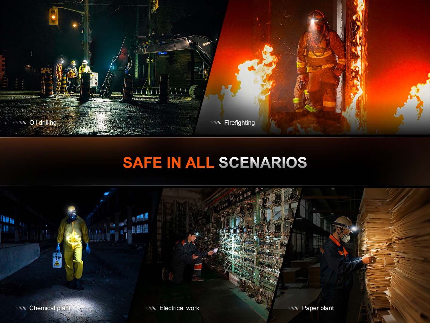Fenix WH35RE je bezpečná pracovní čelovka do výbušného prostředí, určená pro různé oblasti s rizikem výbuchu, kromě podzemních dolů. Je opatřena certifikací ATEX/IECex. Nabízí maximální výkon 280 lumenů a napájí ji jeden speciálně upravený Li-ion akumulátorem ARB-L21-3000Ex s kapacitou 3000 mAh (je součástí balení), který se dobíjí přímo ve svítilně přes moderní USB-C konektor. Praktičnost čelovky zvyšuje možnost vyjmout světlo z hlavového držáku a používat ji i jako kapesní či pracovní svítilnu. Navíc je čelovka opatřena ocelovou odnímatelnou sponou, takže ji snadno uchytíte na kapsu či popruh. Její velký spínač umožňuje jednoduché a přesné ovládání – dokonce i v rukavicích.
