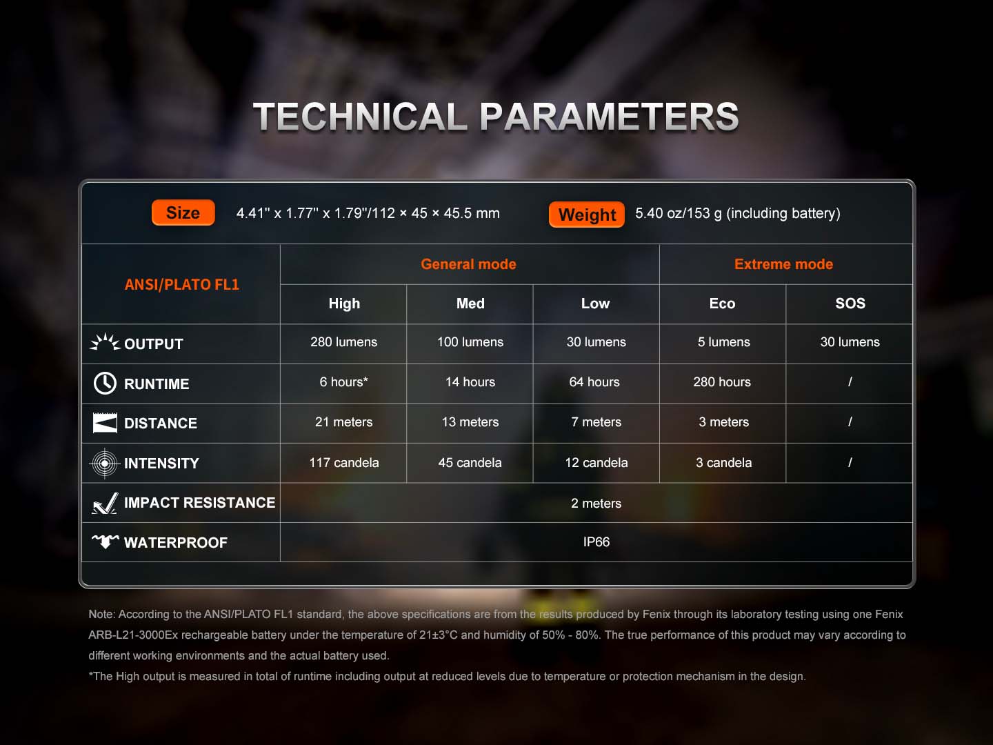 • Používá speciální Li-ion akumulátor Fenix ARB-L21-3000Ex s kapacitou 3000 mAh. Jedná se o upravený typ certifikovaný pro výbušná prostředí.