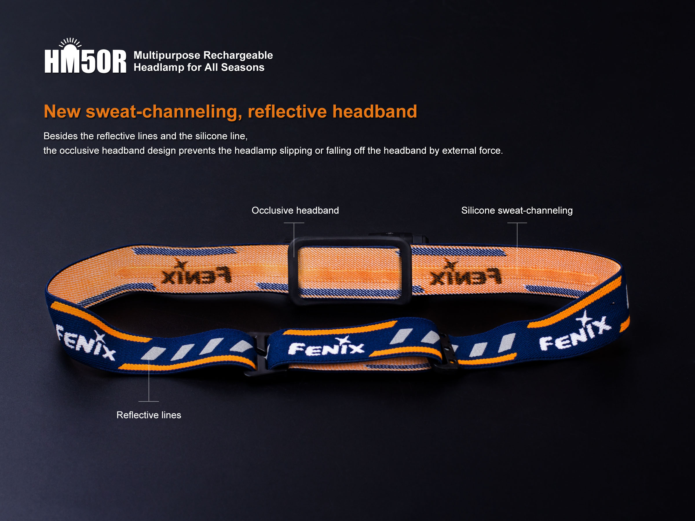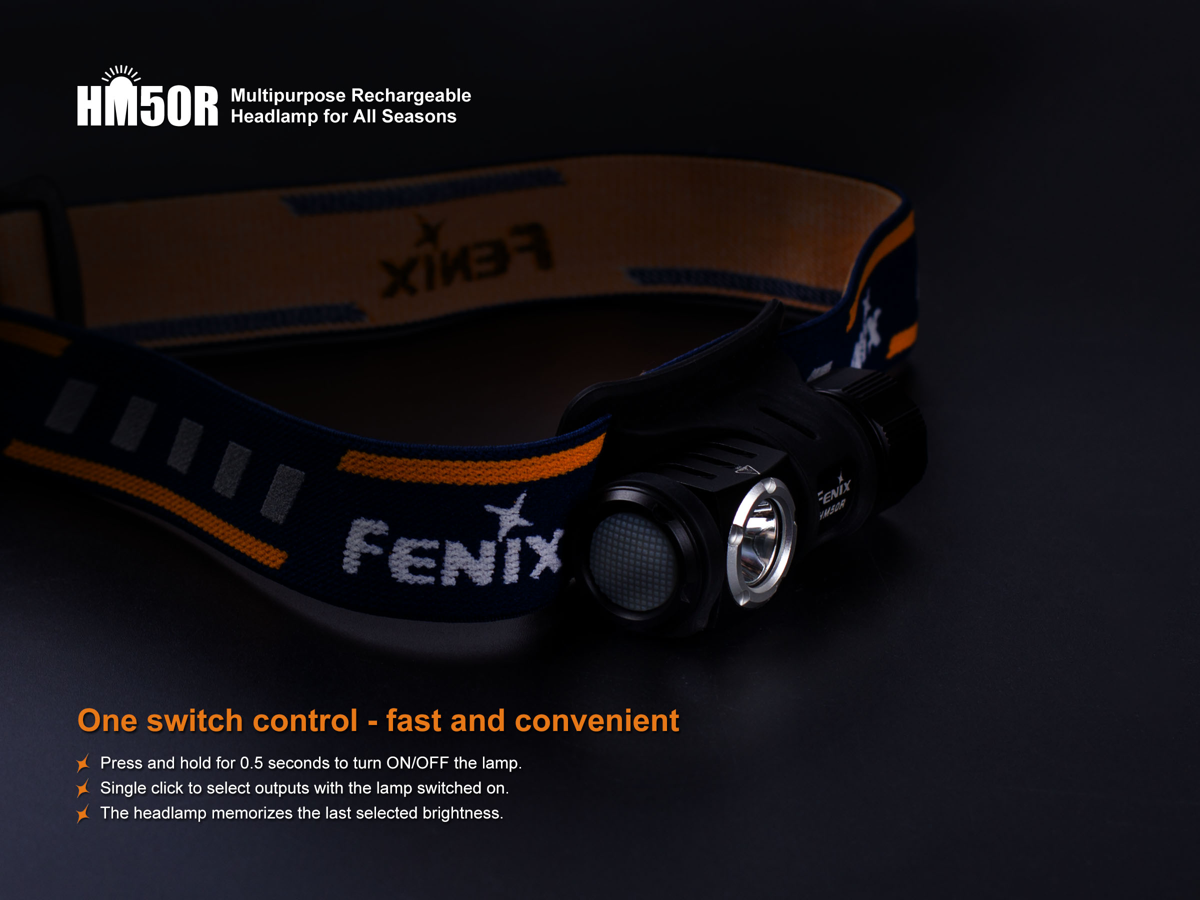 Fenix HM50R je malá vysoce výkonná nabíjecí čelovka s funkcí prodlužující výdrž. K napájení lze použít buď Li-ion akumulátor RCR123A (je součástí balení), nebo jednorázovou baterii CR123A. Akumulátor RCR123A lze dobíjet přes micro USB konektor přímo v čelovce. Přes své kompaktní rozměry nabízí úctyhodný světelný tok až 500 lumenů a dosvit až 80 metrů. Světelným zdrojem je špičková LED Cree XM-L2 U2. V ovládacím tlačítku na boku čelovky je též zabudována indikační dioda, která po stisknutí ukazuje stav nabití baterie.