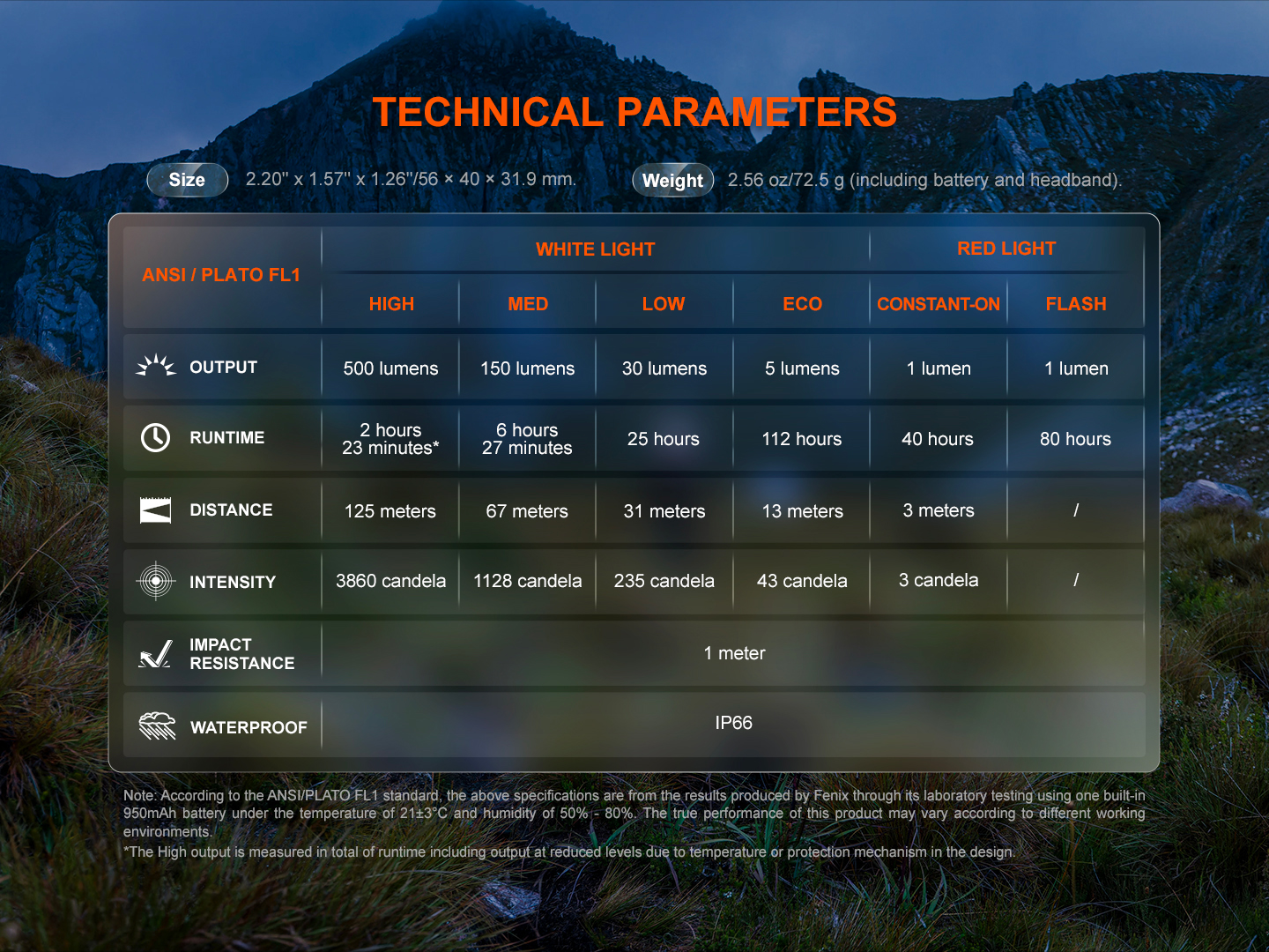Všechny parametry čelovky (světelný tok, doba provozu na baterie, vodotěsnost, dosvit a nárazuvzdornost) jsou změřeny v souladu s normou ANSI/NEMA FL 1-2009.