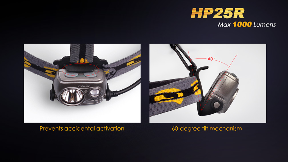 Nabíjecí čelovka Fenix HP25R se vyznačuje unikátní konstrukcí se dvěma reflektory. Jeden reflektor vytváří dobře zaostřený světelný paprsek a druhý reflektor má světelnou stopu velmi širokou a plynulou. Navíc je čelovka osazena červenou LED. Ovládání obou LED je na sobě nezávislé. Široký i dálkový reflektor nabízí čtyři stupně svícení a červená LED dva režimy (stálé svícení a blikání). K napájení se používá jeden Li-ion akumulátor typu 18650 s kapacitou 2600 mAh, který je součástí balení a nabíjí se přes micro-USB konektor přímo v čelovce. V případě nouze lze čelovku napájet dvěma jednorázovými bateriemi CR123A.