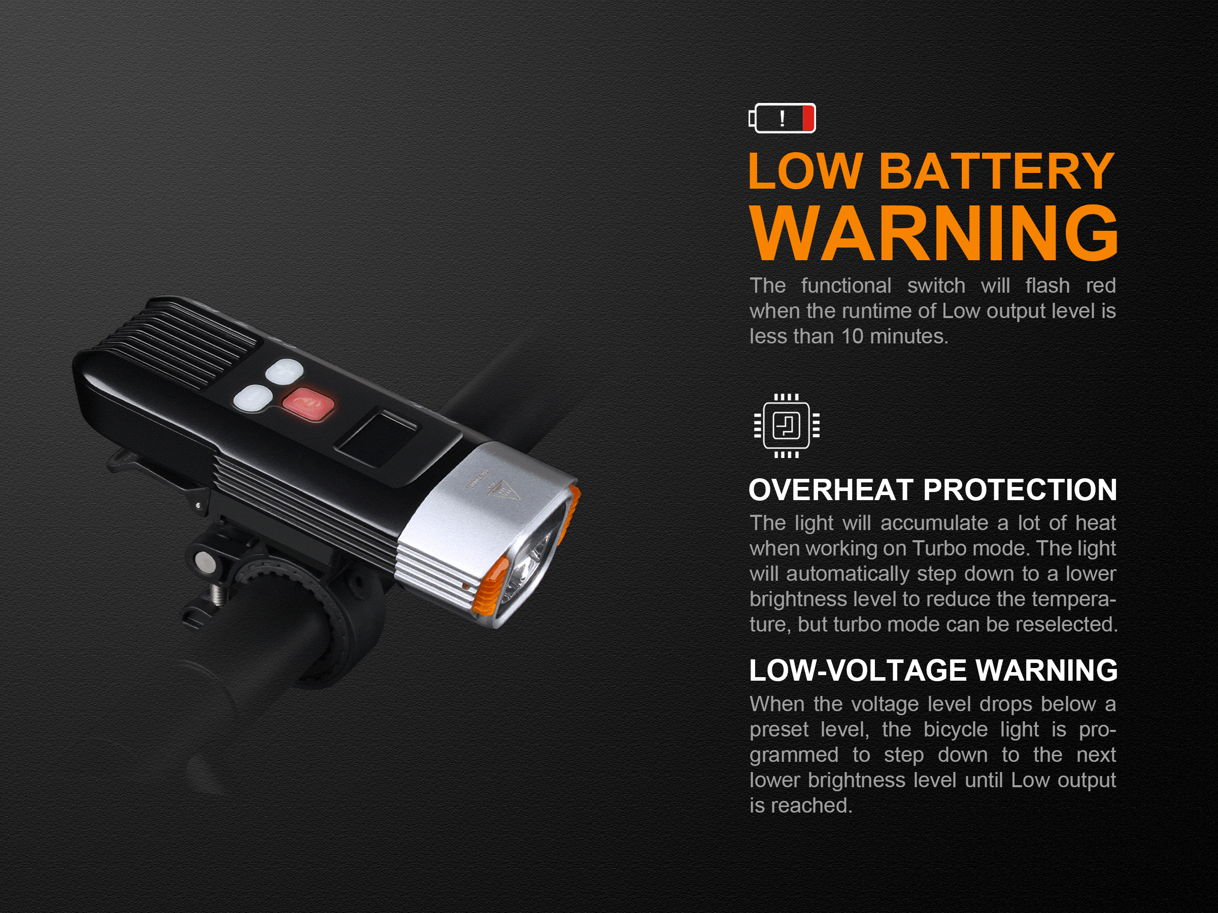 Pokud napětí akumulátoru klesne pod stanovenou úroveň, tak svítilna postupně automaticky přepne do nižších režimů výkonu pro zajištění co nejdelší výdrže. Pokud zbývající čas svícení v nejnižším režimu poklesne pod 10 minut, začne horní tlačítko červeně blikat. V takovém případě doporučujeme svítilnu co nejdříve nabít, aby nedošlo k vypnutí ochranné elektroniky zabudované v akumulátorech a tím pádem ke zhasnutí světla.