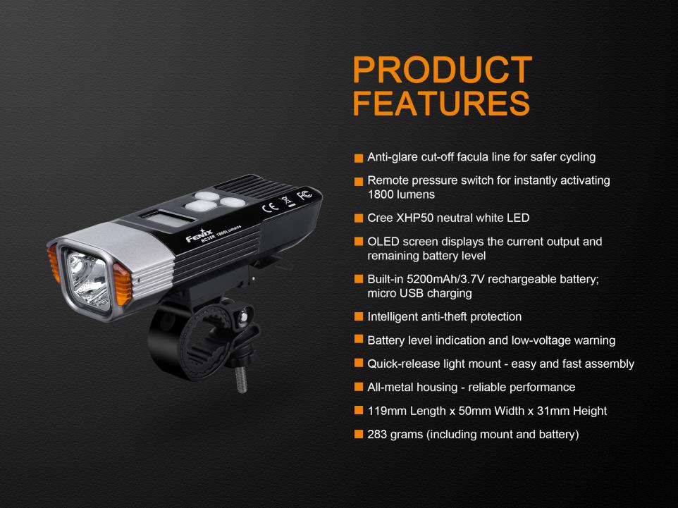 Nabíjecí cyklosvítilna Fenix BC35R přináší světelný tok až 1800 lumenů (ANSI) a dosvit až 146 metrů. K napájení slouží interní Li-ion akumulátor o kapacitě 5200 mAh / 3,7V, který se nabíjí přes micro USB konektor přímo ve svítilně. Světelným zdrojem je moderní LED Cree XHP50 s teplejším odstínem světla (neutral white). Výhodou tohoto odstínu světla je přirozenější a kontrastnější podání barev v terénu. Svítilna používá speciálně tvarovaný reflektor, který směřuje světlo pouze dopředu a do stran, nikoliv nahoru. Světelný kužel je tedy shora ostře uříznutý a neoslňuje ostatní řidiče a chodce. Světlo na kolo Fenix BC35R je proto zvláště vhodné pro použití na silnicích a cyklostezkách.