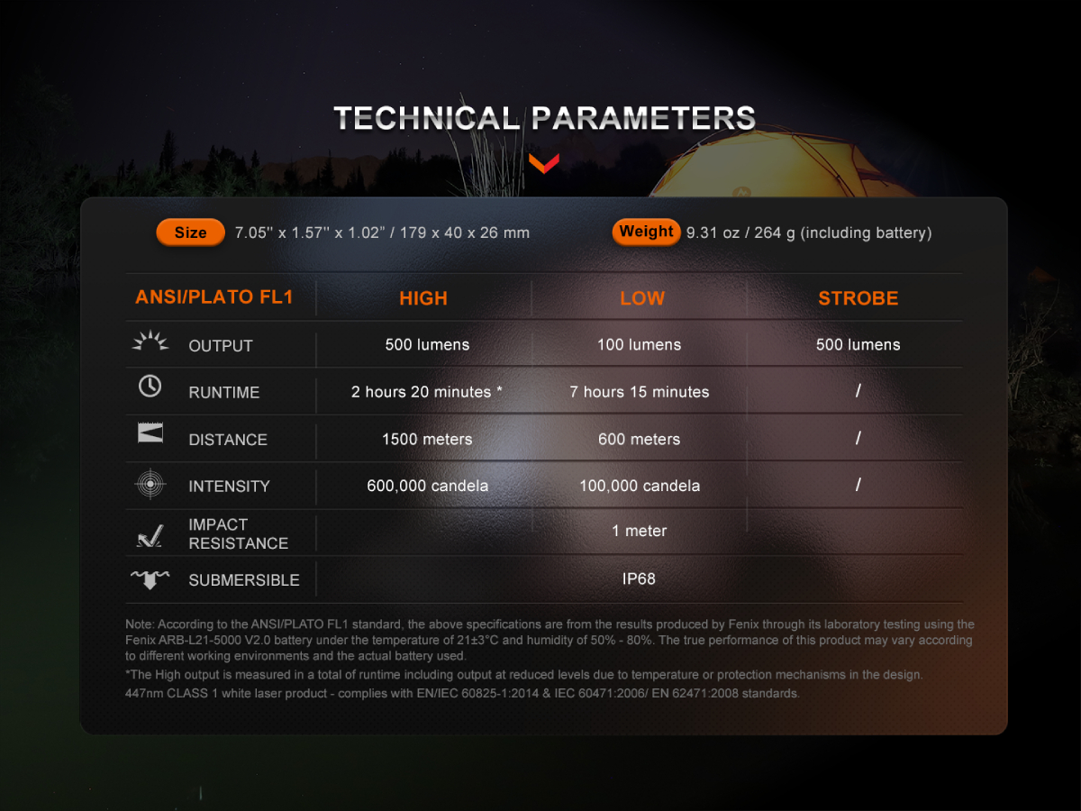 Všechny parametry svítilny (světelný tok, doba provozu na baterie, vodotěsnost, dosvit a nárazuvzdornost) jsou změřeny v souladu s normou ANSI/NEMA FL 1-2009.