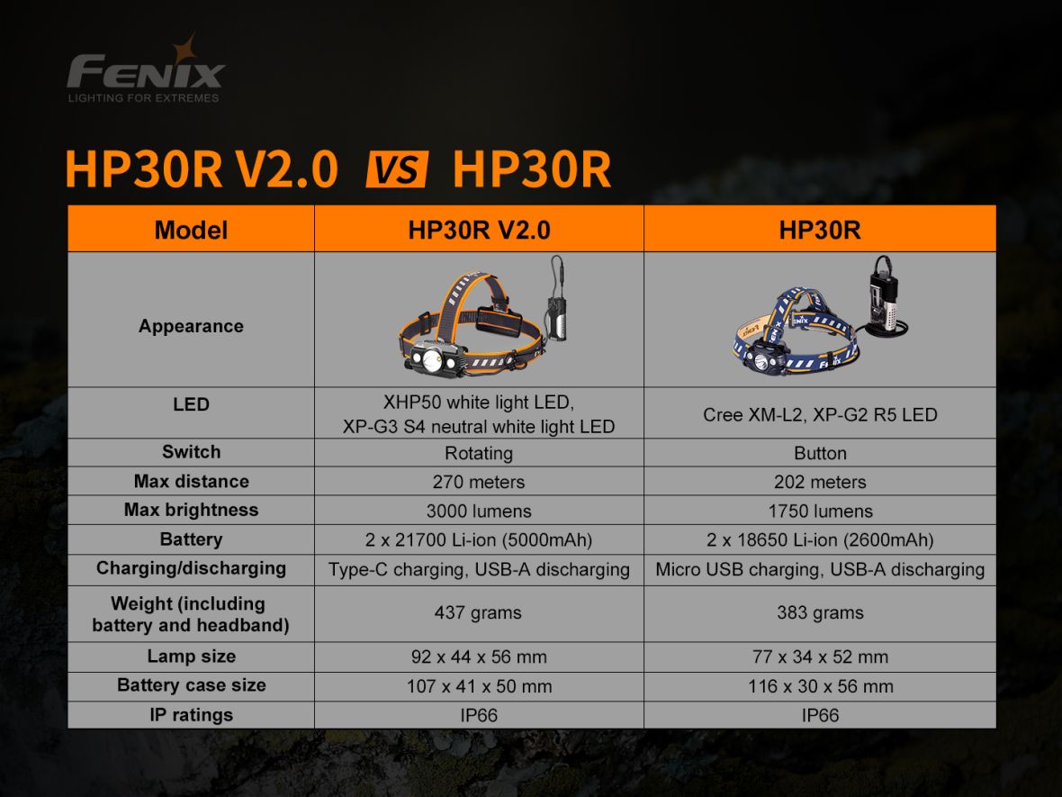 Nabíjecí čelovka Fenix HP30R nabízí bezkonkurenční výkon až 3000 lumenů (ANSI) a dosvit 270 metrů. Výborného výkonu bylo dosaženo použitím výkonné LED XHP50 a dvojice LED XP-G3 S4 s teplejším odstínem světla. Čelovka je vybavena dálkovým reflektorem a dvojicí menších reflektorů s širokým kuželem světla. Oba reflektory jsou ovládány odděleně či je případně možné je pustit současně v kombinovaném módu.. K napájení používá dva Li-ion akumulátory typu 21700 5000 mAh, které jsou součástí balení a lze je dobíjet přímo v bateriovém pouzdru přes USB-C konektor.