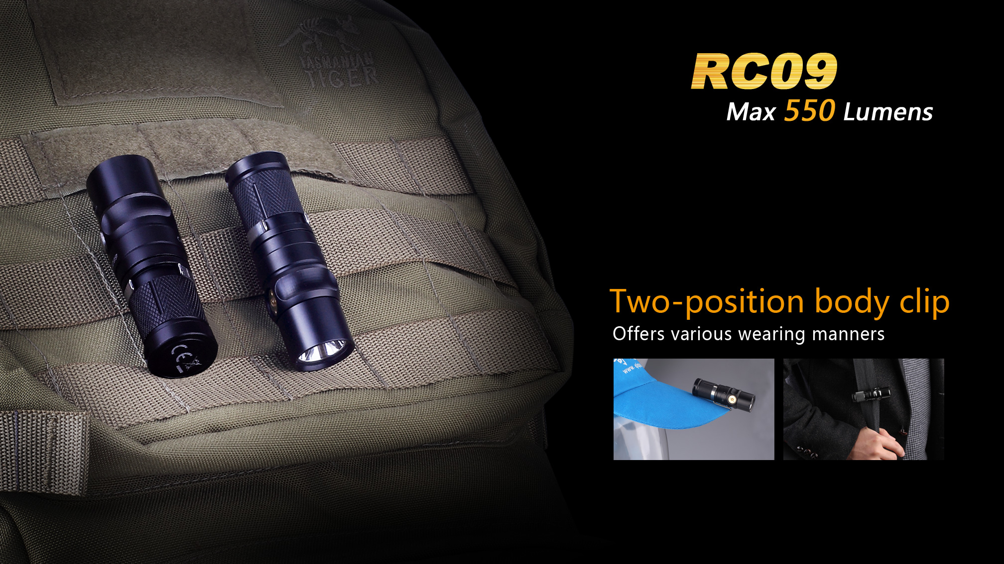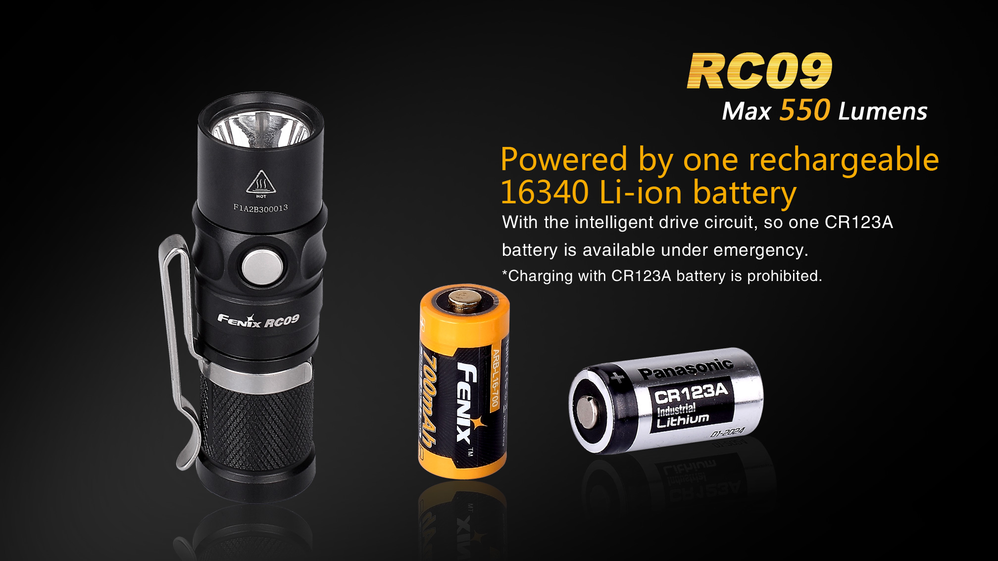 Fenix RC09 je vysoce výkonná nabíjecí kapesní svítilna. Napájí ji jeden nabíjecí akumulátor typu RCR123A, který se dobíjí přímo ve svítilně přes speciální magnetický konektor, alternativně lze použít i jednorázovou litiovou baterii CR123A. Svítilna disponuje pěti různými režimy osvětlení, které umožní volit mezi vysokým výkonem a dlouhou výdrží. Svítilna je napájena digitálně kontrolovaným konstantním proudem pro zaručení stálého světelného výkonu i při snižování napětí v bateriích.