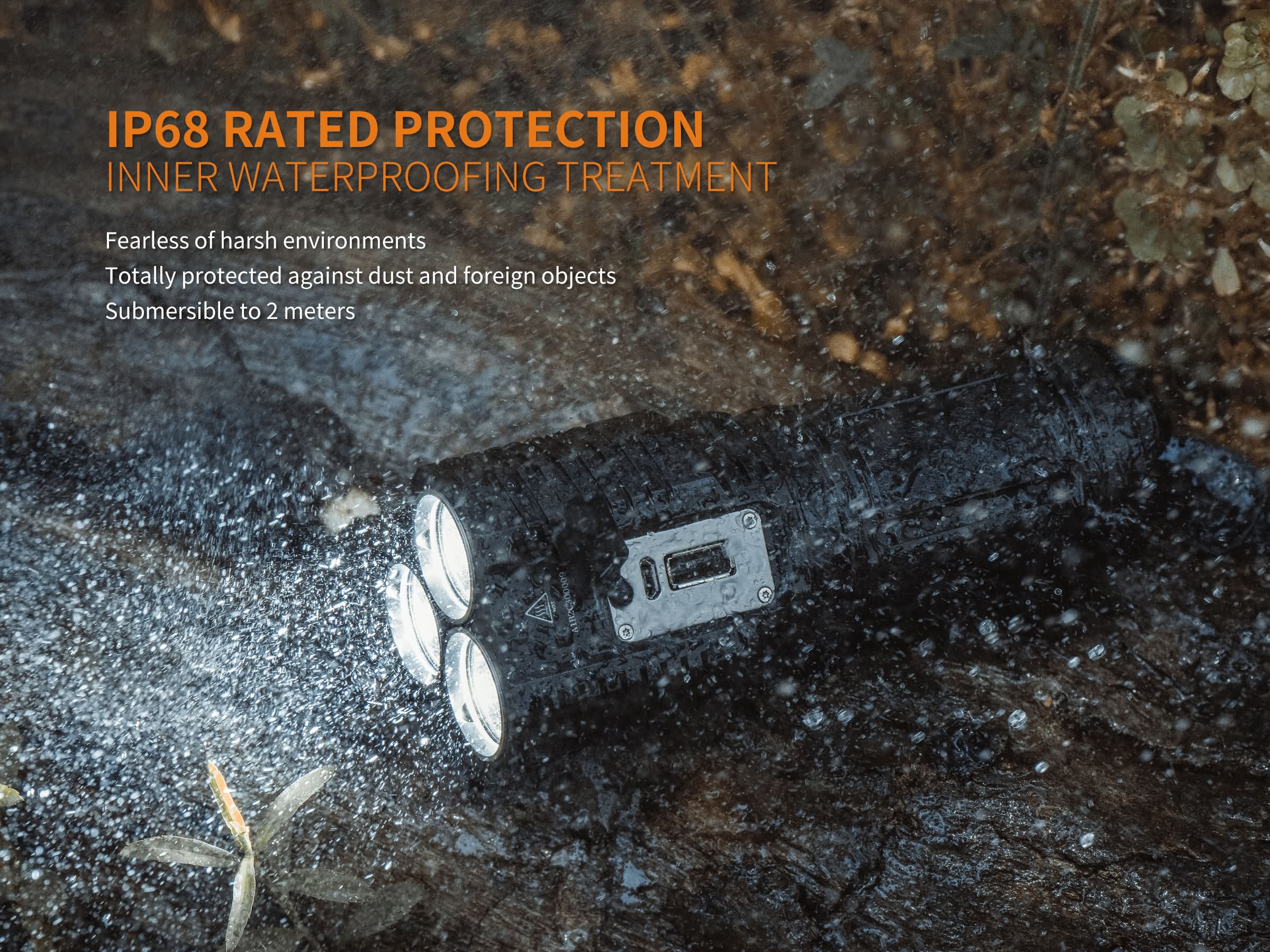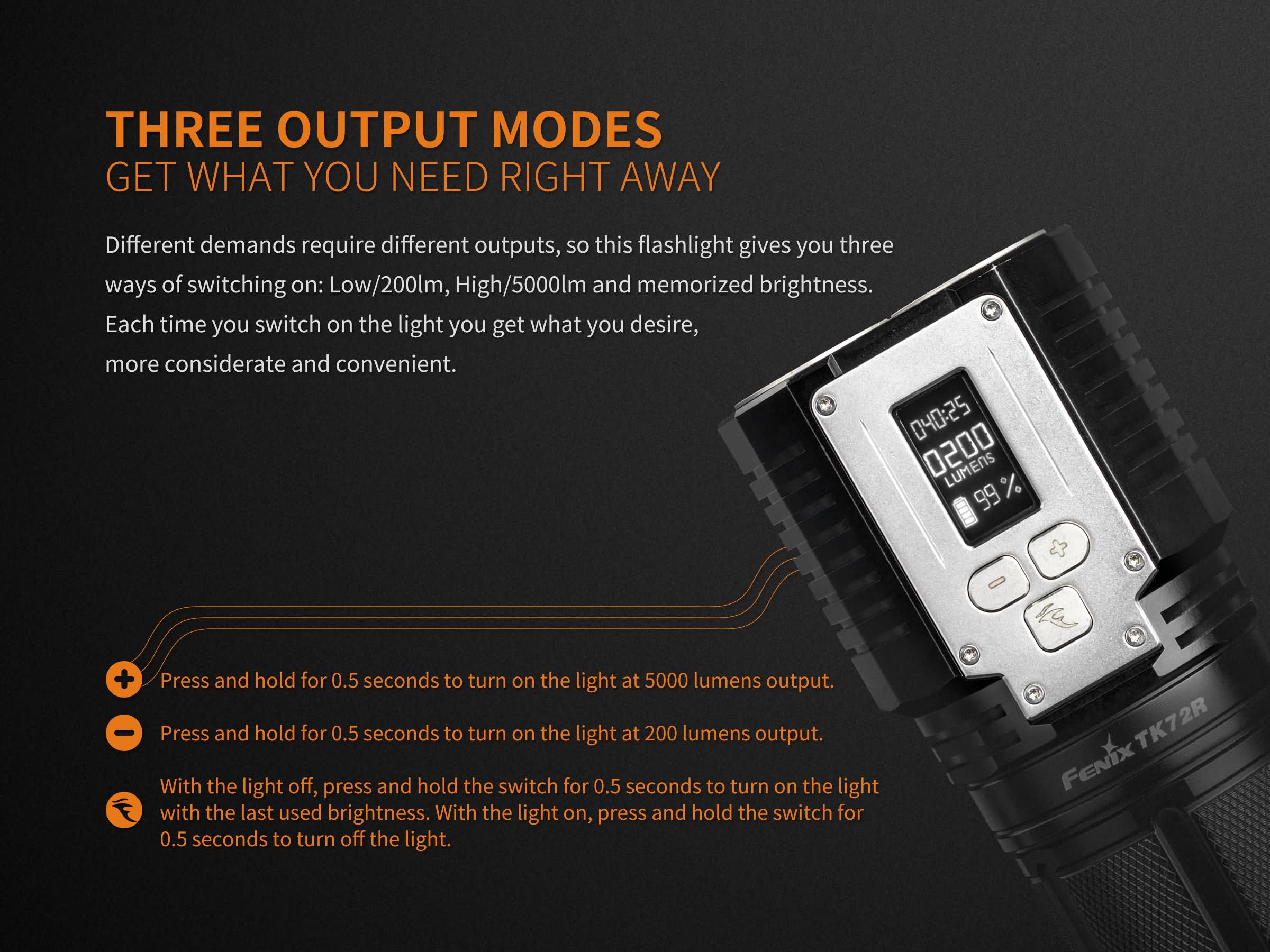 Ultra výkonná nabíjecí svítilna Fenix TK72R přináší extrémní světelný tok až 9000 lumenů (ANSI) a široký kužel s dosvitem až 286 metrů. Svého výkonu dosahuje pomocí třech vysoce výkonných LED Cree XHP70, které jsou napájeny z interního Li-ion akumulátoru s kapacitou 50,4 Wh, který se dobíjí přímo ve svítilně skrze micro USB konektor. Svítilna nabízí unikátní ovládání pomocí tří tlačítek, díky kterému lze plynule měnit výkon od 100 do 9000 lumenů v krocích po 100 lumenech. Navíc je k dispozici i zábleskový režim stroboskop. Svítilna je navíc vybavena OLED displejem, který ukazuje stav baterie, zvolený režim a dobu svícení. Navíc je možné svítilnu nouzově použít i jako powerbanku a nabíjet z ní další USB zařízení. Tato vyhledávací svítilna je vhodná například pro ostrahu velkých areálů, služební použití či průzkumné a záchranné operace a pro všechny nadšence do svítilen.