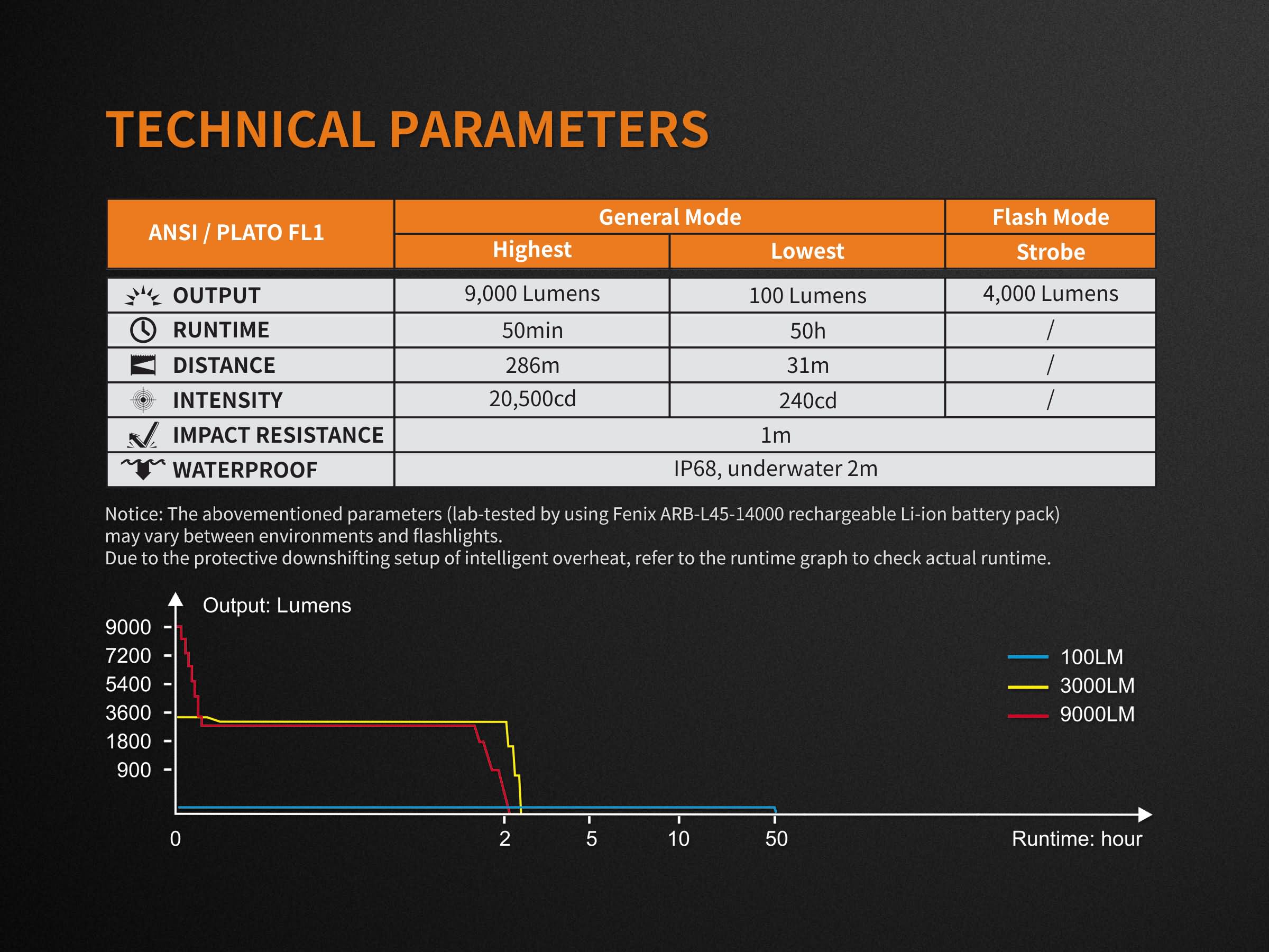 Všechny parametry svítilny (světelný tok, doba provozu na baterie, vodotěsnost, dosvit a nárazuvzdornost) jsou měřeny v souladu s normou ANSI/NEMA FL 1-2009 Flashlight Basic Performance Standard