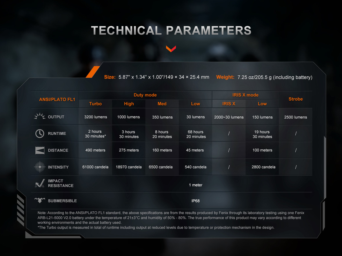 Všechny parametry svítilny (světelný tok, doba provozu na baterie, vodotěsnost, dosvit a nárazuvzdornost) jsou změřeny v souladu s normou ANSI/NEMA FL 1-2009.