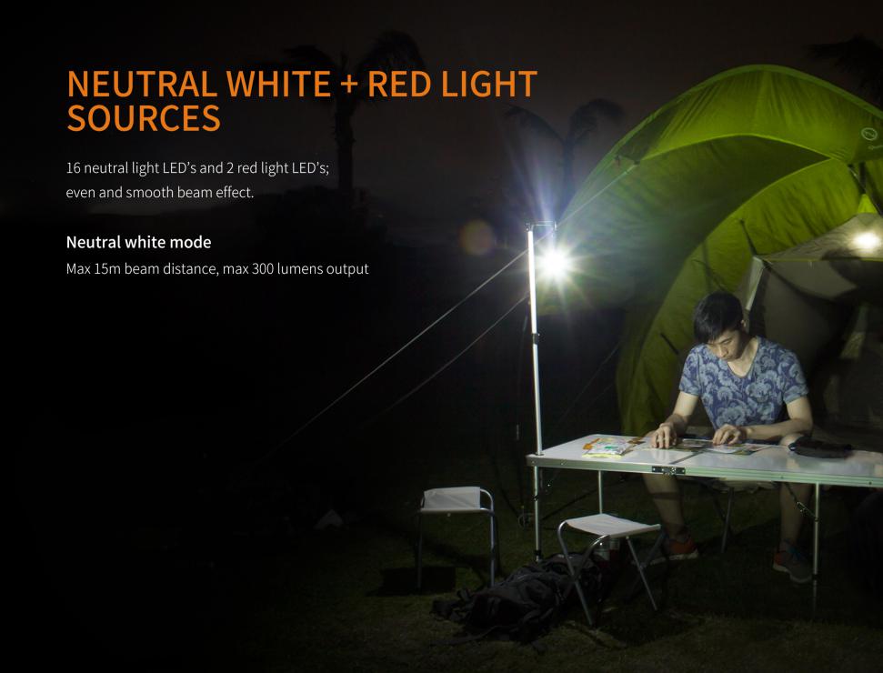 Fenix CL20R je praktická nabíjecí přenosná lucerna, kterou můžete použít pro osvětlení místnosti, stanu či pracovního stolu. Šestnáct vysoce jasných diod ukrytých pod polokulovým difuzérem poskytuje světelný tok až 300 lumenů (ANSI) s neutrálním odstínem bílého světla. Výhodou tohoto odstínu světla je přirozenější a kontrastnější podání barev v přírodě. Napájení zajišťuje zabudovaný lithium-polymerový akumulátor, který se dobíjí přes micro-USB konektor. Lucerna nabízí celkem šest režimů svícení včetně červeného světla, které nenarušuje adaptaci očí na tmu.