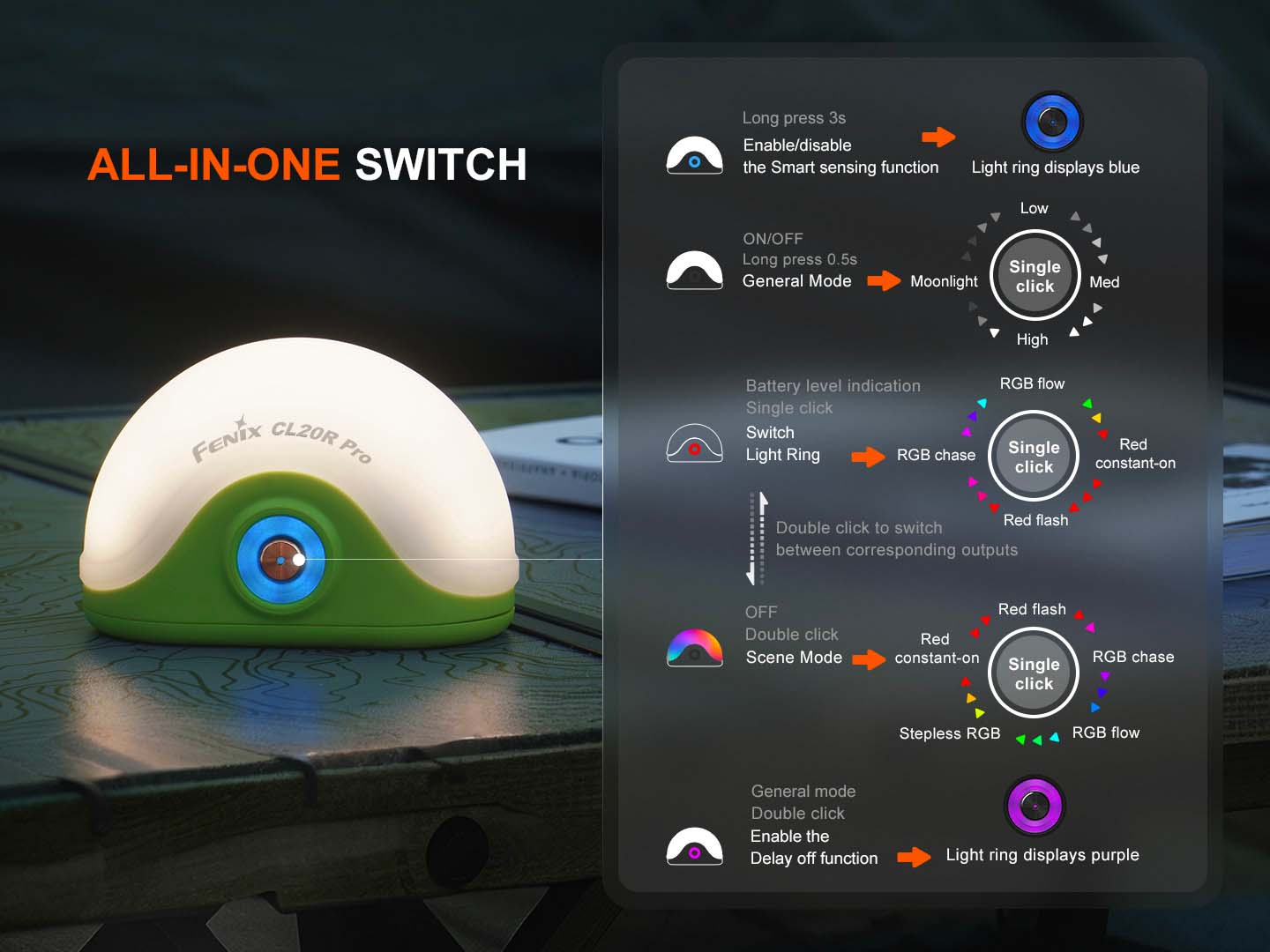 Přepínání způsobů svícení – Funkce odloženého vypnutí: Pokud je lucerna zapnutá do režimů bílého světla, dvakrát rychle stiskněte spínač, tím se aktivuje funkce odloženého vypnutí. Světelný prstenec spínače se rozsvítí fialově a lucerna se po 20 minutách sama vypne. Pokud je lucerna zapnutá do barevných režimů svícení nebo má aktivní barevný prstenec, tak mezi těmito dvěma způsoby svícení se přepíná dvojitým stisknutím spínače. Pokud je aktivní režim plynulé změny barev, pak dvojitým stisknutím spínače pozastavíte aktuální barvu nebo opět obnovíte plynulou změnu barev.