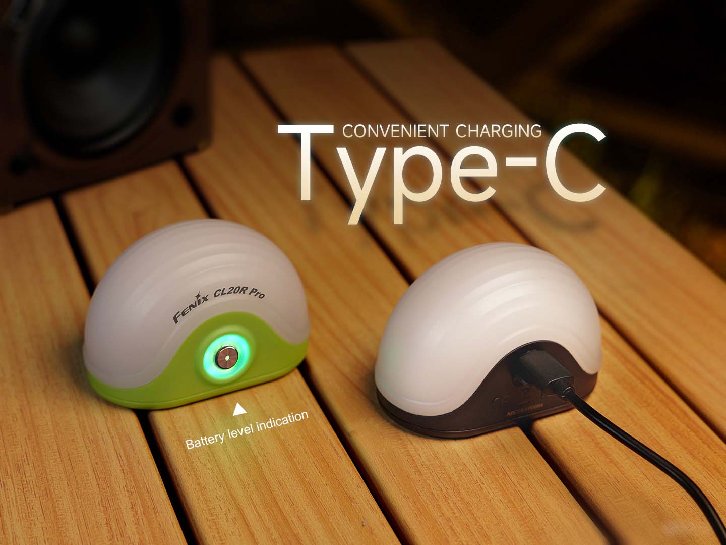 Nabíjení – Odklopte protiprachovou krytku a zapojte nabíjecí kabel USB-C do nabíjecího portu svítilny. Po dokončení nabíjení protiprachovou krytku opět utěsněte. Běžná doba nabíjení je 2,5 hodiny. Během nabíjení lze lucernu používat ve všech režimech. Během nabíjení světelný kroužek spínače postupně zeleně problikává proti směru hodinových ručiček. Po plném nabití se rozsvítí zeleně. Pro prodloužení životnosti baterie doporučujeme nabíjet lucernu, když je úroveň nabití mezi 50 % a 25 %. Pokud úroveň nabití klesne pod 25 %, je vhodné okamžité nabití. Nepřipojujte nabíjecí kabel k lucerně, pokud používáte AAA baterie.