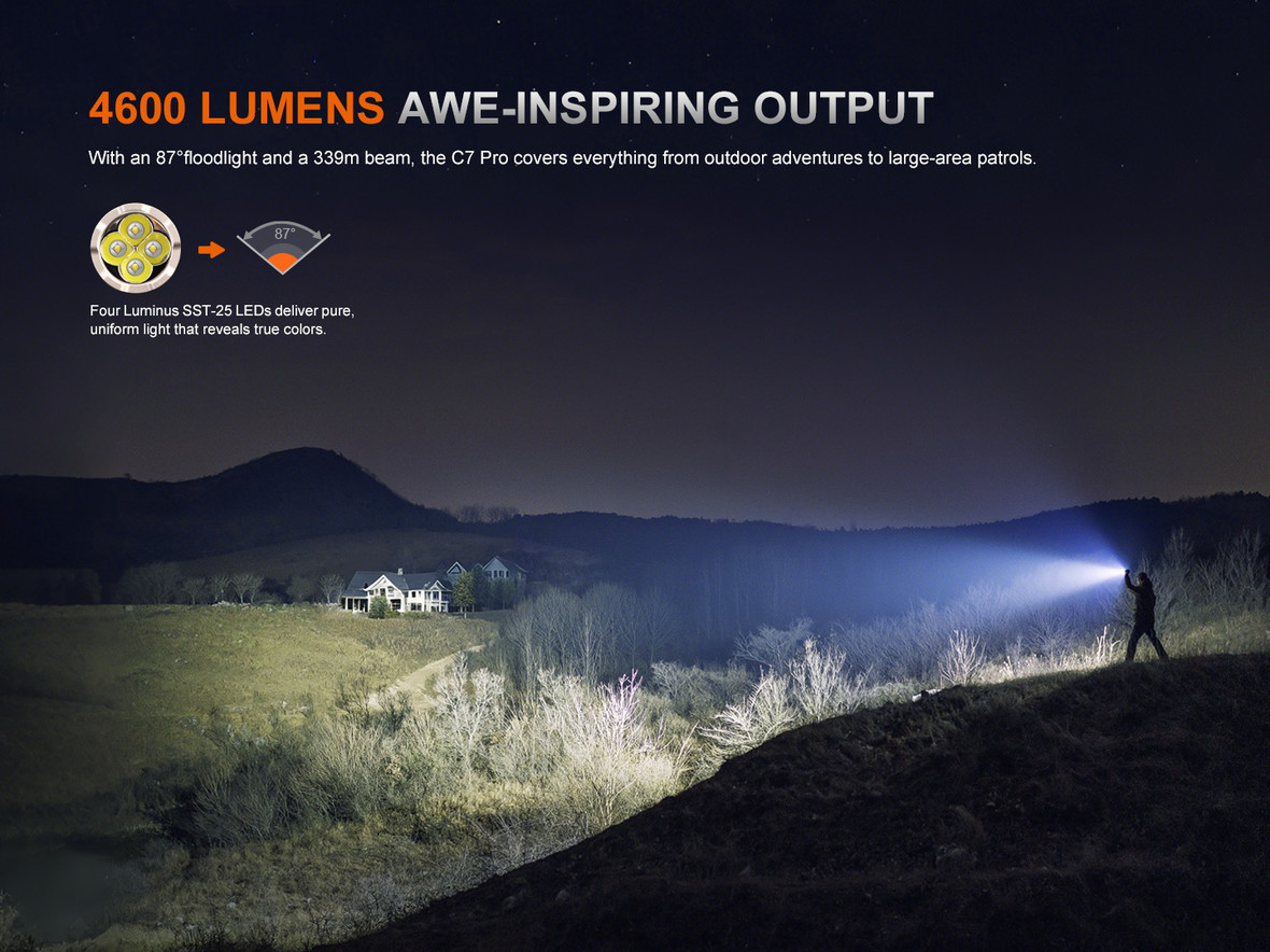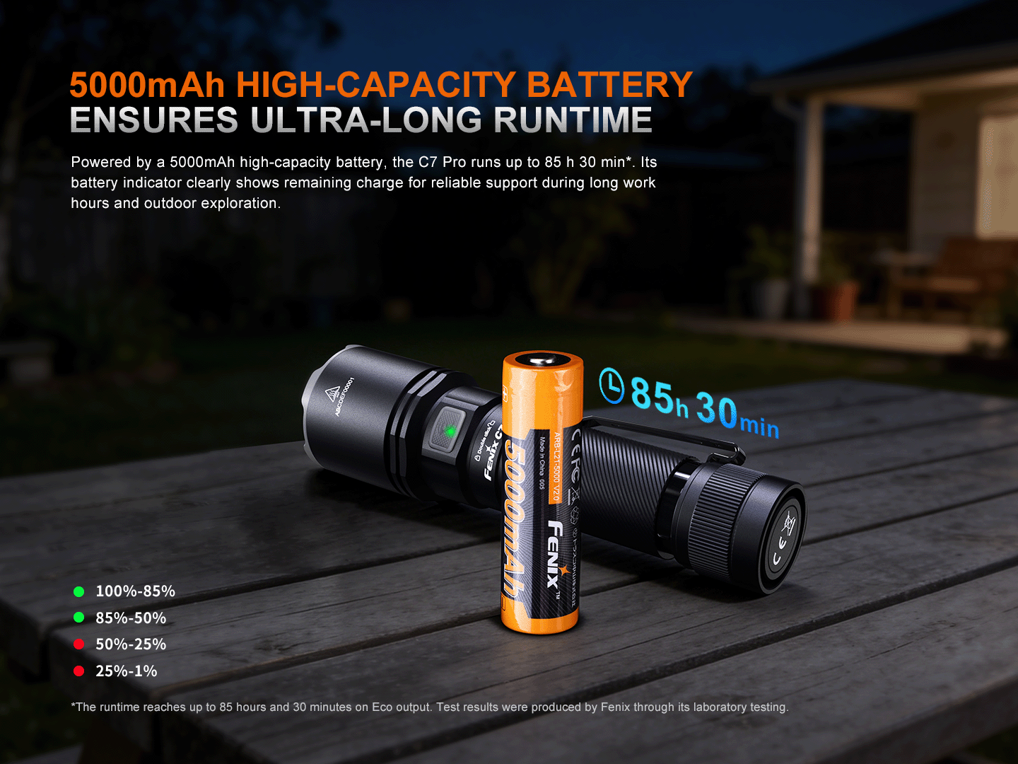 Fenix C7 PRO je nekompromisní nabíjecí svítilna stvořená pro ty, kteří vyžadují extrémní výkon a maximální spolehlivost. Nabízí skvělý světelný tok až 4600 lumenů (ANSI) s dosvitem do vzdálenosti neuvěřitelných 339 metrů. Srdcem svítilny je špičkový Li-ion akumulátor typu 21700 s kapacitou 5000 mAh (je součástí balení), který pohodlně a rychle nabijete přímo ve svítilně přes moderní USB-C konektor.