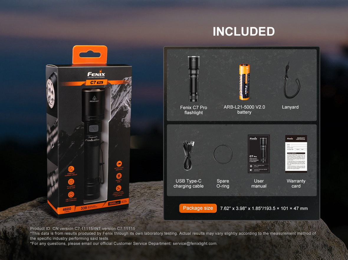 • Ke svítilně je přiložen akumulátor Fenix ARB-L21-5000 V2.0, nabíjecí USB-C kabel, šňůrka na zápěstí a náhradní o-kroužek.