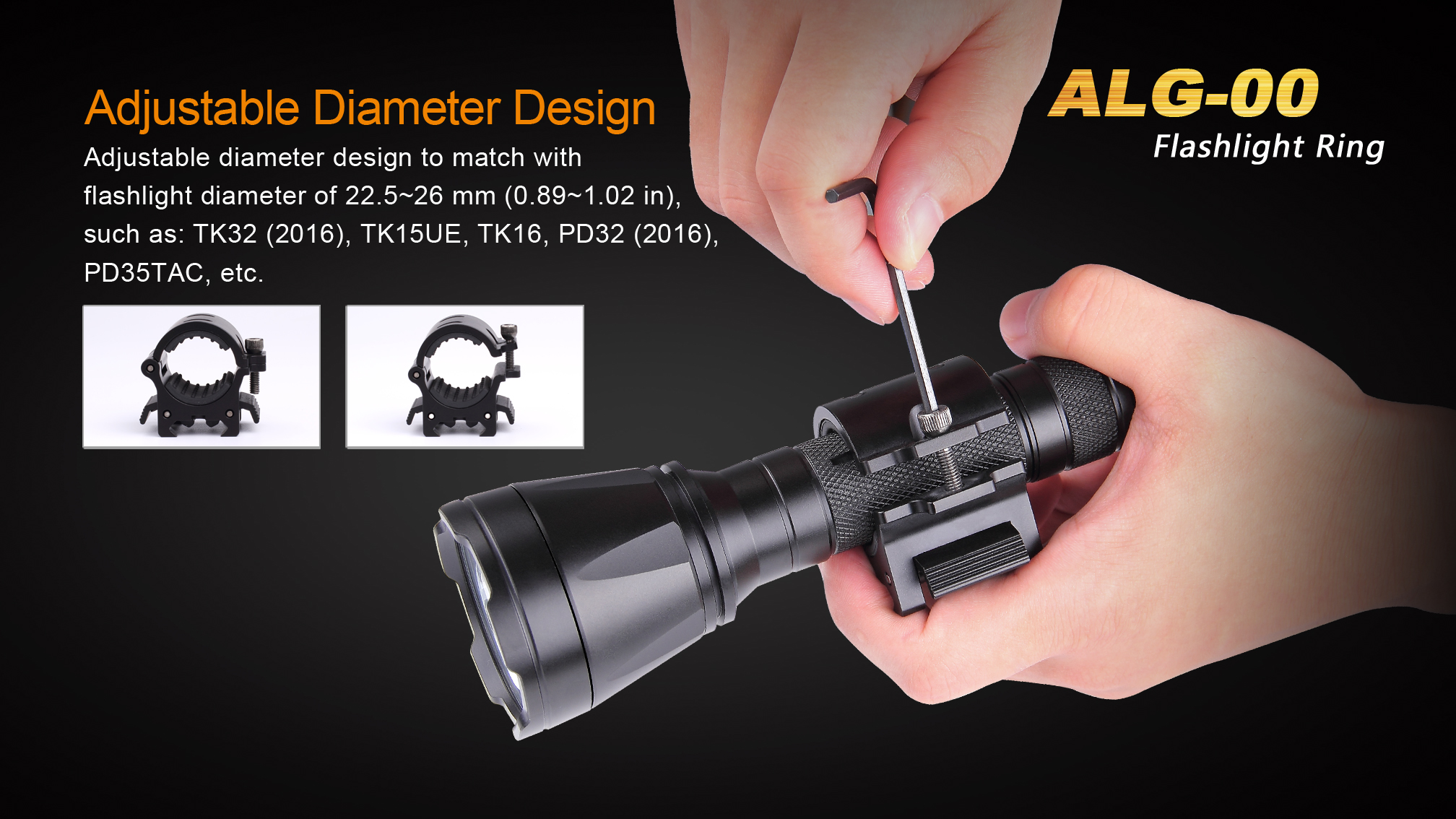 Rychloupínací kovová montáž svítilny na normalizovanou zbraňovou lištu (Weaver / Picatinny). Vhodné pro svítilny s průměrem těla 22,5 – 26,0 mm. Vhodná například pro svítilny Fenix PD32, Fenix PD35, Fenix UC35, Fenix TK09, Fenix TK15, Fenix TK16, Fenix TK20R, Fenix TK32.