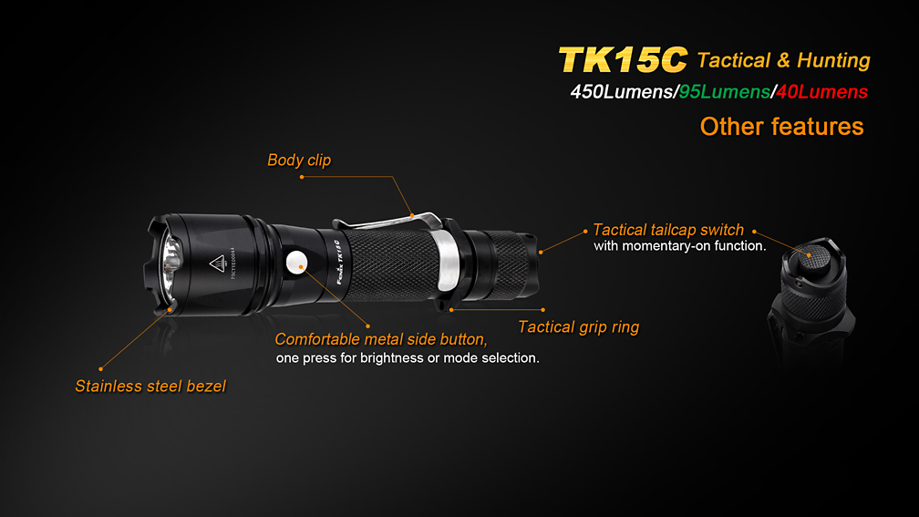 Taktická svítilna Fenix TK15C se vyznačuje unikátní konstrukcí reflektoru, který ukrývá tři LED. Kromě klasické bílé Cree XP-G2 o výkonu 450 lumenů a s dosvitem 200 metrů lze využít i LED se zeleným (95 lumenů, dosvit 65 metrů) a červeným (40 lumenů, 26 metrů) světlem. TK15C si samozřejmě zachovává přednosti taktických svítilen Fenix, jako je odolnost, nárazuvzdornost a vodotěsnost. Napájení zajišťují dvě lithiové baterie CR123A, nebo jeden li-ion akumulátor 18650. Široká škála příslušenství rozšiřuje použitelnost svítilny v akci – se svítilnou je kompatibilní např. vzdálený kabelový spínač AR102, difuzér AOD-M či dopravní kužel AOT-M.