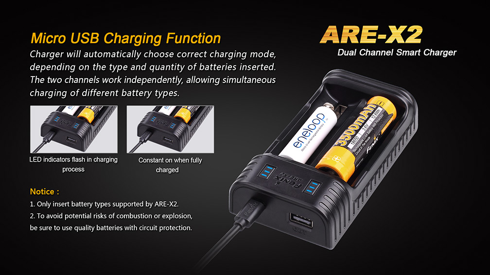 Kompaktní dvoukanálová USB nabíječka Fenix ARE-X2 na Li-ion a NiMH/NiCd akumulátoru. Při vložení nabitého Li-ion akumulátoru funguje i jako záložní zdroj (power bank) pro nabíjení USB zařízení (mobilní telefony, MP3 přehrávače a další). Tato funkce je dostupná pouze při vložení akumulátoru typu Li-ion. Nabíječka je určena pro 3,7V a 3,6V lithium iontové akumulátory a 1,2V nikl-metalhydridové a nikl-kadmiové akumulátory velikosti AA, AAA.Každý nabíjecí slot je monitorován nezávisle, takže lze najednou nabíjet baterie různých velikostí, kapacit a dokonce i různých chemií (Li-Ion i NiMH/NiCd je možné nabíjet najednou).