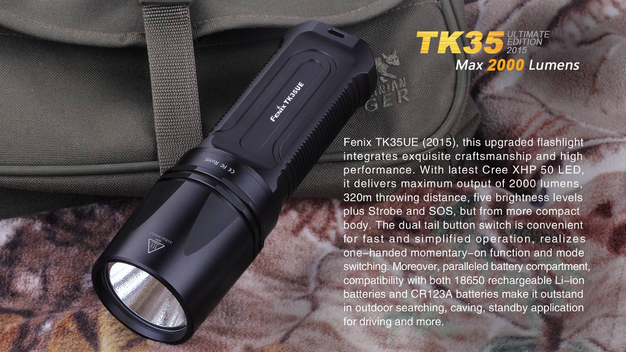 Druhá generace svítilny Fenix TK35 Ultimate Edition nabízí extrémní světelný tok až 2000 lumenů. Mimořádného světelného toku bylo dosaženo použitím vysoce výkonné LED Cree XHP50, která v kombinaci s texturovaným reflektorem vytváří široký, plynulý světelný kužel. Díky systému dvou koncových spínačů lze rychle a pohodlně přepínat intenzitu vyzařovaného světla. TK35 UE je vhodná pro všechny situace, kde oceníte široce osvětlený prostor a nekompromisní výkon.