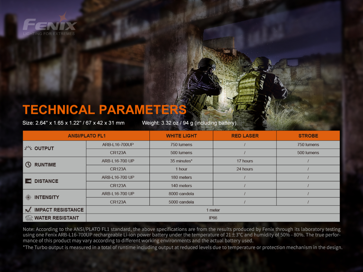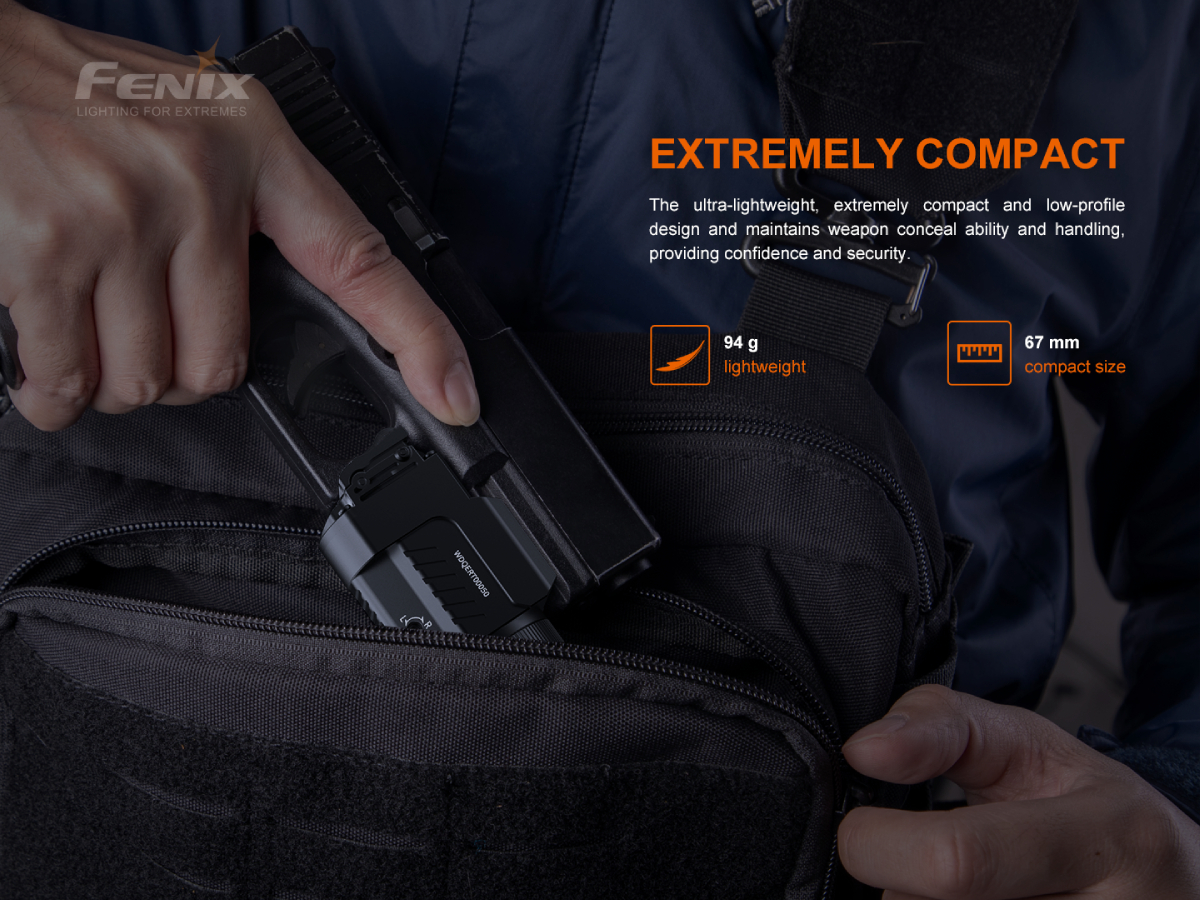 Laserová pistolová LED svítilna Fenix GL22 je zkonstruována speciálně pro použití na krátkých zbraních. Výkon bílého světla je 750 ANSI lumenů s dosvitem až 180 metrů, dále svítilna disponuje červeným laserem, který je vhodný pro snadnější zaměření cíle (směr svícení laseru lze jemně nastavit). Svítilna je napájená jedním Li-ion akumulátorem Fenix ARB-L16-700UP s integrovaným micro-USB konektorem (akumulátor i kabel jsou součástí balení). V případě potřeby lze použít i jednorázovou lithiovou baterii CR123A. Zjednodušené ovládání svítilny je oboustranné (pro praváky i leváky). Svítilna umí fungovat ve třech režimech – pouze bílé světlo, bílé světlo + červený laser, nebo jen samostatný červený laser. Bílé světlo lze momentálně přepnout i do stroboskopického blikání. Montáž na zbraňovou lištu je snadná – svítilna se nasune na zbraňovou lištu a zajistí se otočným kolečkem (lze pevně dotáhnout například mincí). Lze ji připevnit na zbraňové lišty standardu Picatinny MIL-STD-1913 a GLOCK. Svítilna je vhodná pro profesionály i sportovní a hobby střelce.